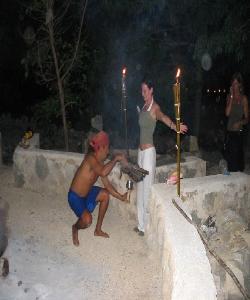| 19:00 PARTENZA DAGLI HOTELS 20:00 ARRIVO A DOS PALMAS SI PROCEDE CON LA CERIMONIA NEL CIRCOLO DEL FUOCO. AL TERMINE LA PURIFICAZIONE INDIVIDUALE DA PARTE DELLO CHAMANO E BAGNO DI VAPORE NEL TEMAZCAL COME FACEVANO GLI ANTICHI MAYA. AL TERMINE BAGNO RINFRESCANTE NELLO SPLENDIDO CENOTE E CENA. SI TERMINA CON LA VISITA ALLA CAPANNA MAYA. 00:30 RITORNO HOTELS |